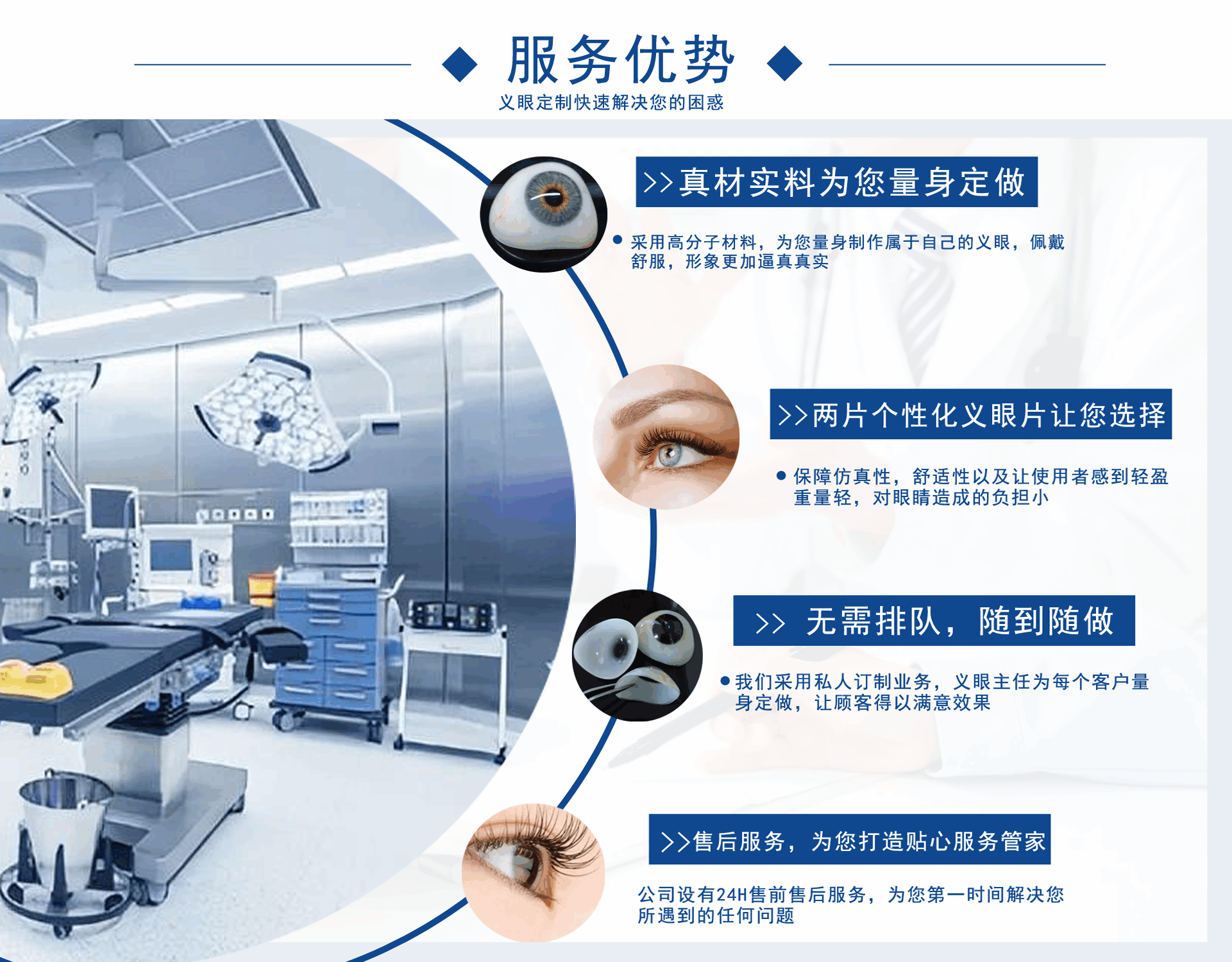 正目醫療科技有限公司致力于為用戶提供假眼,在哪里可以定制義眼,義眼哪家好,假眼價格,義眼價格,義眼費用,義眼公司,是集義眼定制、保養、咨詢為一體的綜合性義眼定制企業?! —殑摰牧x眼工藝結構,根據仿生物學原理,采用進口醫用植入材料:高分子材料、無毒素、性能穩定、堅固耐用)、聚甲基丙乙烯阝-羥乙酯HEMA材料(軟性親水性材料),結合獨特的義眼個性化佩戴技術,按佩戴者健眼的形態、角膜、虹膜、及瞳孔的大小、色澤、血管紋理和脂肪分布,設計制作。擁有超薄、質輕、光滑、親水透氧、佩戴舒適和高逼真的特點。為保證佩戴效...
